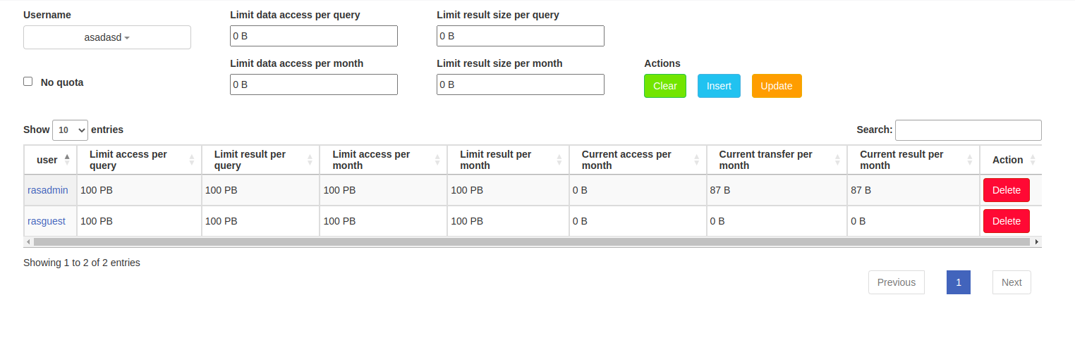 The quota management capabilities of rasdaman allow to set rules per user. Quotas on resource usage can be defined per request, as well as aggregated per calendar month. This is most convinient to manage in the Web admin interface.