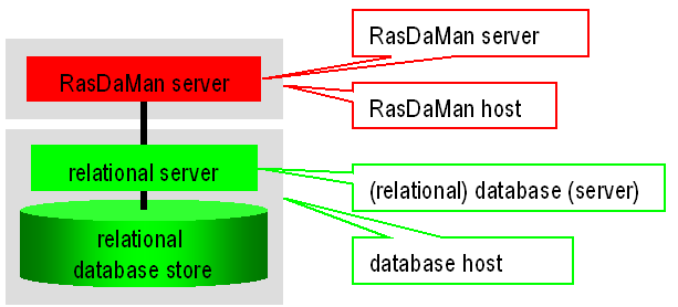 For storage of multi-dimensional array data, rasdaman can be configured to use some conventional database system (such as PostgreSQL) or use its own storage manager. For the purpose of this documentation, we will call the conventional database system to which rasdaman is interfaced the base DBMS, understanding that this base DBMS is in charge of all alphanumeric data maintained as relational tables or object-oriented semantic nets.